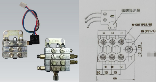 在遞進(jìn)式油路分配器片組中,設(shè)有循環(huán)指示桿,分配器每一次工作循環(huán),循環(huán)指示桿動(dòng)作一次,當(dāng)指示桿伸出接觸到循環(huán)指示器中的微動(dòng)開關(guān),微動(dòng)開關(guān)動(dòng)作,以監(jiān)測潤滑系統(tǒng)是否出現(xiàn)失壓、斷流或者超負(fù)荷的狀況。