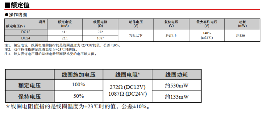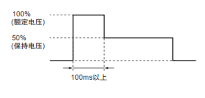 其中保持電壓需要注意的點是繼電器動作后將線圈電壓降低至保持電壓使用時,請如下圖所示,首先對線圈施加額定電壓100ms以上,且線圈保持電壓需為額定電壓的50%以上,避免因線圈電壓變動等爾低于該值。