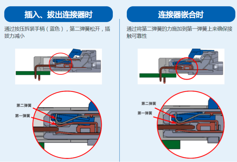特征1其特點雙彈簧結構:在嵌合時通過第一彈簧和第二彈簧的接觸合力確保接觸可靠性,并在插拔時通過操作手柄打開第二彈簧來減小插拔力。如下圖