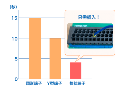 相比采用螺釘方式連接圓形端子、Y型端子,以推入方式連接棒狀端子時的連接工時可減少60%以上。