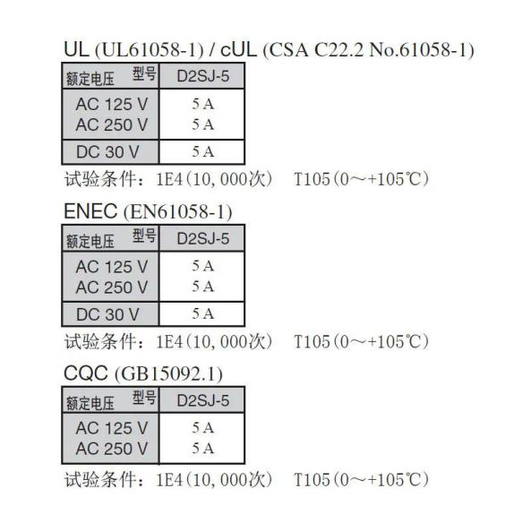 對(duì)歐姆龍而言,安全向來(lái)重要。歐姆龍D2SJ的額定電壓、額定電流均達(dá)到中國(guó)CQC、北美UL和歐洲ENEC的安全標(biāo)準(zhǔn),并全面落實(shí)中國(guó)、北美和歐洲GB15092.1、UL61058-1、EN61058-1要求的指標(biāo)。值得一提的是歐姆龍D2SJ在DC 500V時(shí),絕緣電阻可達(dá)100MΩ以上,電阻阻值越大,流過(guò)它的電流越小,故使用起來(lái)也就越安全。