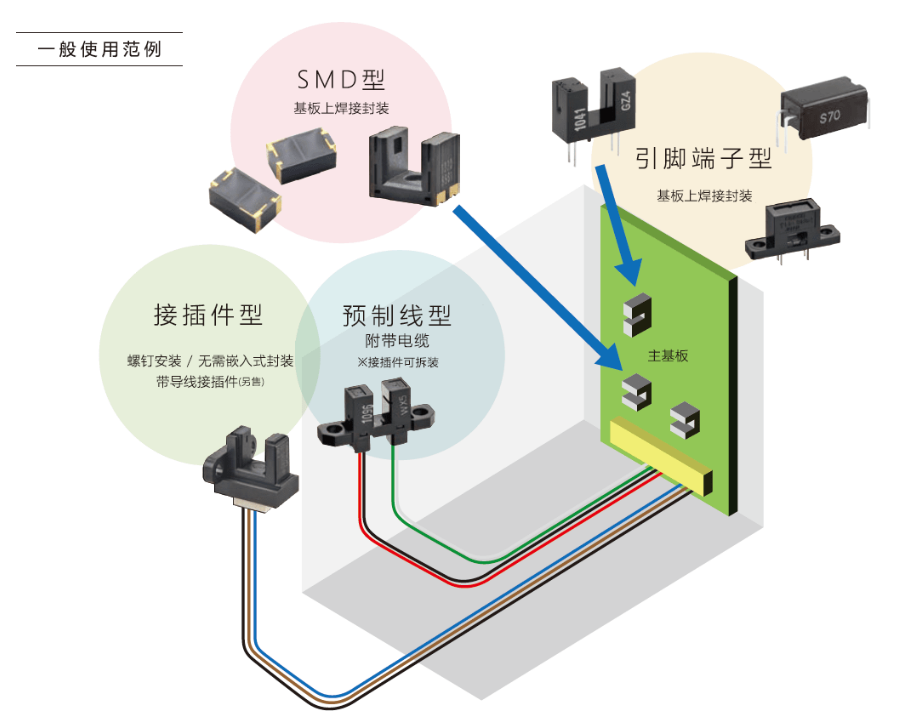 透過型微型光電傳感器中,發光元件的發光面和接受光線并發出信號的受光元件受光面相對而立,物體通過兩者的間隔,會遮住光線,引起受光元件受光量的變化。